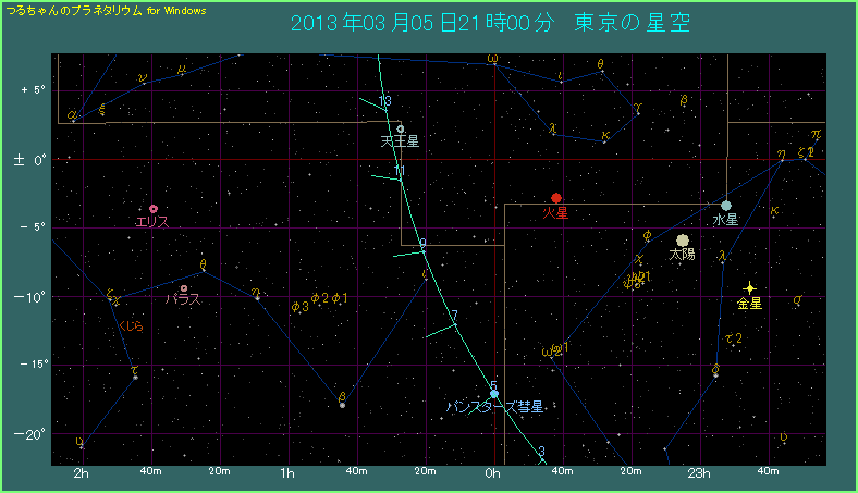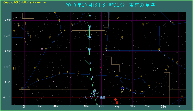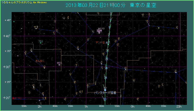 3月10日の近日点通過を終えた後も、パンスターズ彗星は一直線に北上を続けます。うお座に入り、明るい星が少ない領域を移動していきます。移動量は相変わらず大きめで、2日経つとだいぶ位置が変わっています。期間の前半は2等級の明るさがあり、彗星としては明るくて立派なものです。期間の後半も3等級と明るい状態です。尾の長さは少しずつですが短くなっていきます。期間中はヘペガスス座のγ星からたどるのがわかりやすいでしょう。