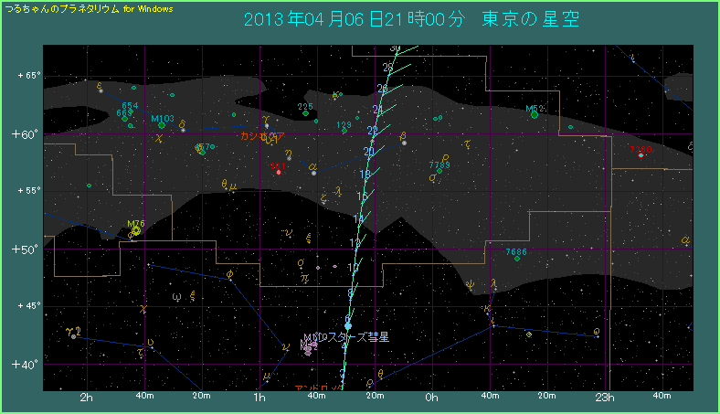 2月下旬から3月上旬にかけて、みなみのうお座から北上を始めます。北へ移動しながら次第に明るさも増し、ちょうこくしつ座、みずがめ座をかすめて、くじら座へ入ります。3月10日にうお座で近日点通過して最も明るくなった後は、光度を落としながら引き続き北へ進路をとります。ペガスス座の東側(図では左側)に位置するアンドロメダ座を南北に串刺しにするように進んだ後、4月に入るとカシオペア座を通り、5月にはケフェウス座まで移動します。
