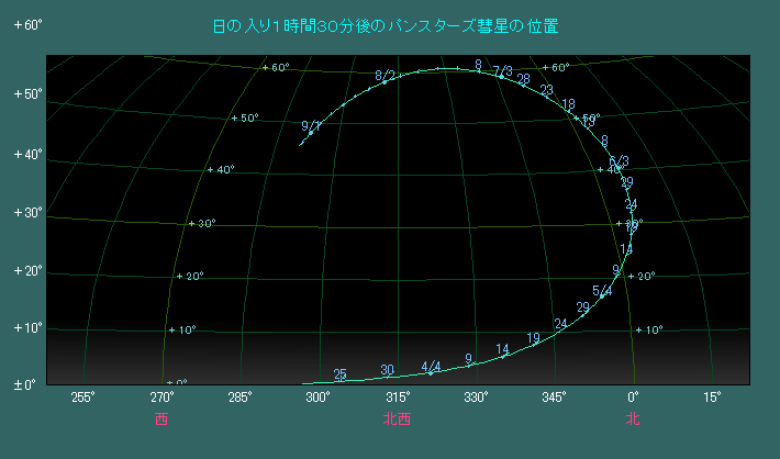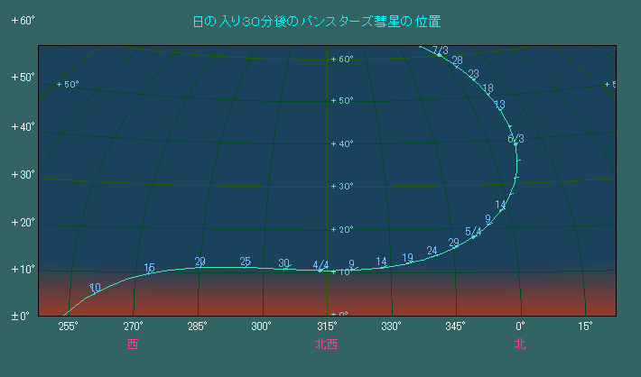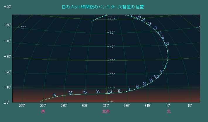 日の入り時刻におけるパンスターズ彗星の位置(西方向)