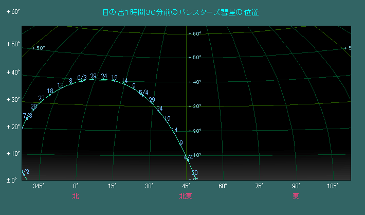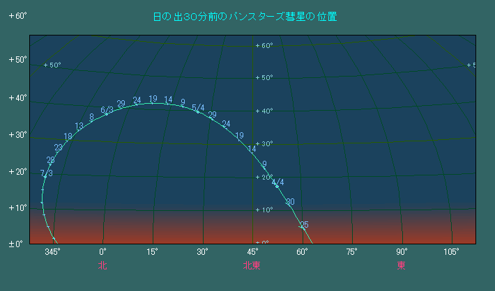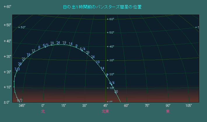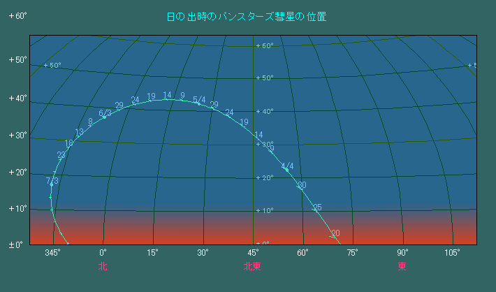 日の出時刻におけるパンスターズ彗星の位置(東方向)