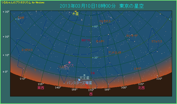 天文ソフト「つるちゃんのプラネタリウム」は、つるちゃんが作成したフリー(無料)の天文ソフトです。これを使えば様々な天文シミュレーションを行うことができます。ここでは天文ソフト「つるちゃんのプラネタリウム」を使って、操作の例を挙げながらパンスターズ彗星の見え方を調べましょう。