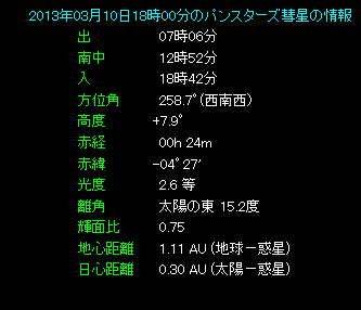 上記のプラネタリウム画面と同時に、下のような観測データ画面が表示されます。これを見ると、東京の日の入りは17時44分であることや、パンスターズ彗星が沈む時間は18時42分であることがわかります。観測可能な時間帯は19時09分から4時35分とありますが、これは暗夜で観測できる時間帯を示しています。ですからパンスターズ彗星は、周囲が明るいうちに観測しなければならないことがわかります。