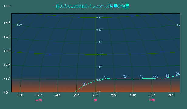 このように操作すると、下のような画面が表示されます。これは、日の入りから30分が経過した時刻に、パンスターズ彗星がどの位置に見えるかを連続的に線で描いたものです。日の入りから30分しか経っておらず、空はまだ薄明状態です。3月上旬から4月上旬にかけて、パンスターズ彗星の高度がサッパリ高くならず、見づらいことがおわかりいただけるでしょう。