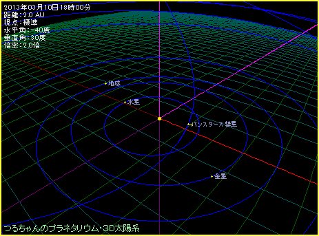 このように操作すると、下のように太陽系が表示されます。地球から見たパンスターズ彗星は、太陽をはさんで反対側に位置していますね。言い換えると、地球から見たパンスターズ彗星は太陽からあまり離れていません。ですから、近日点通過となる3月10日頃は観測しづらいことがわかります。