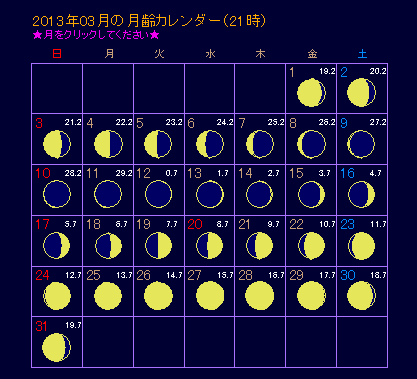 下のような月齢カレンダーが表示されましたか。3月10日の場合だと月齢は28.2ということで新月に近く、天体観測時に月明かりの影響を受けないことがわかります。なお、この画面で月をクリックすると、月の情報が別ウィンドウで表示されます。