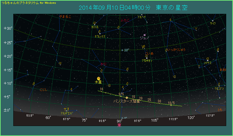 パンスターズ彗星は夜明け前に見えます。下の星図は9月10日の4時ごろ、東京から東の方角の低い位置を見た場合の星図です。ほぼ真東の低い位置で、うみへび座の頭部を形作る特徴的な星の配列を探しましょう。うみへびの頭のすぐ下あたりに双眼鏡を向けると、ボーッと淡い光の塊が見つかります。これがパンスターズ彗星です。