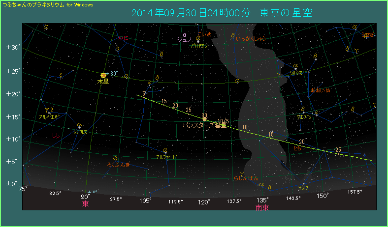 図を見ると、9月上旬は東、10月上旬は南東、10月下旬は南にあり、左から右へ移動していくことがわかります。また、高度は10月10日前後に最も高くなり、25度くらいに達することもわかります。