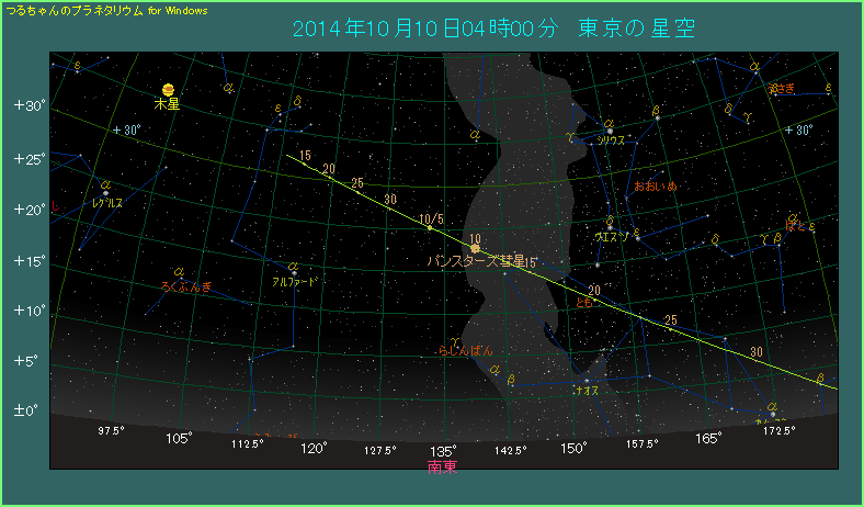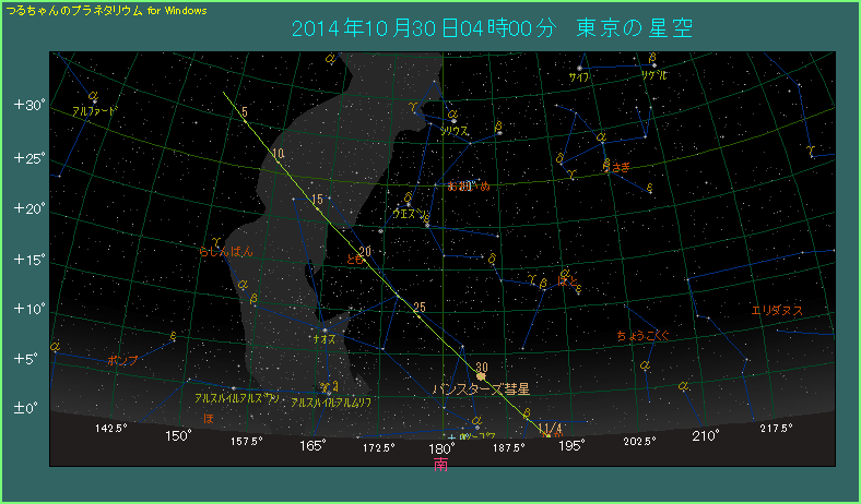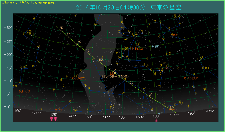 このところパンスターズ彗星の動きが大きくなっています。それというのも10月末から11月初旬にかけて、パンスターズ彗星と地球が最接近するからです。明るさもほんの少しだけ明るくなって6.7等です。東の方角には月齢25.5という三日月程度の月明りがありますが、大きな妨げにはなりません。