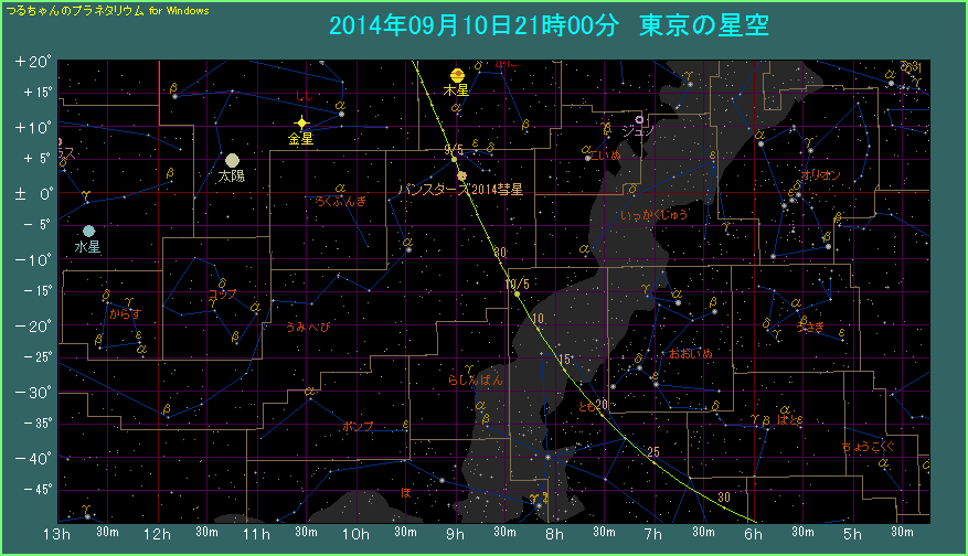 9月上旬にパンスターズ彗星は、うみへび座の頭部をかすめた後10月になると、とも座に入ります。10月20日頃におおいぬ座をかすめるような経路をとり、とも座を大きく横切ります。ちょうどこの頃に地球へ近づくことから、1日あたりの移動量が大きくなります。11月に入ると、がか座に入ります。しかし、赤緯が-50度を超えてきて、日本からは観測しづらくなってしまいます。
