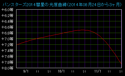 下のグラフはパンスターズ彗星の光度変化を表した光度曲線です。9月1日は7.1等ですが、その後ジワジワと明るくなります。明るさのピークは10月中旬の後半で、6.7等の明るさです。大ざっぱに言うと、ここまでは概ね7等級といえば間違いないでしょう。しかし、その後は一気に暗くなり、11月下旬になると8等まで落ち込んでしまいます。