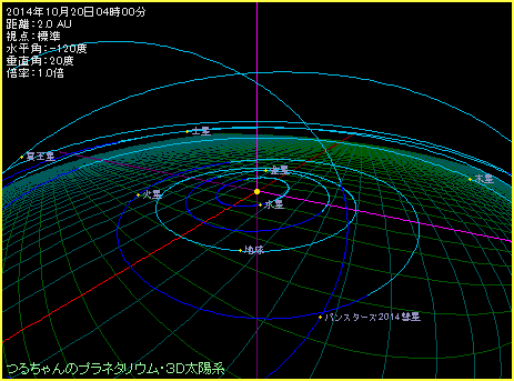 下の図は10月20日におけるパンスターズ彗星を含めた太陽系の軌道図です。パンスターズ彗星は8月27日に太陽へ最も近づき、すでに近日点通過を果たした状態です。