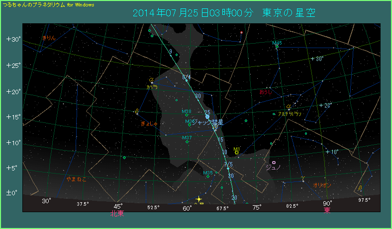 10日が経過しました。下の星図は7月25日、東京から見た3時ごろの東北東のようすです。10日の間にだいぶ上の方へ移動しました。今後もジャック彗星が北上することから、次第に観測条件が良くなってきます。また、地球へ次第に近づいてくることから、彗星の動きが速くなります。