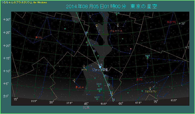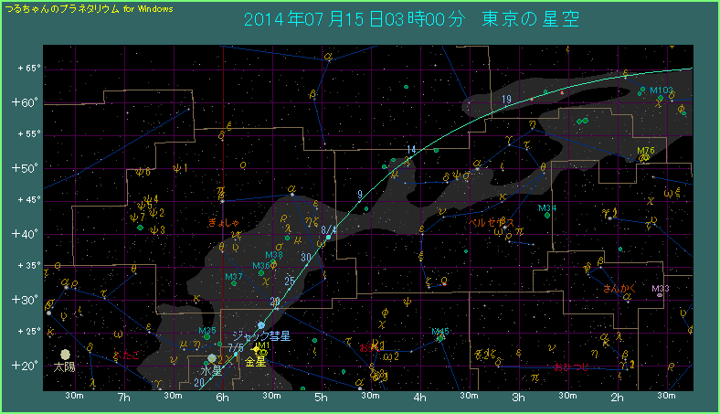 下の星図は7月15日3時ごろ、東京から東北東の方角を見た場合の星図です。低空には非常に明るい金星がありますから、これを目印にして探します。7月15日の場合でしたら、1.7等星で光る おうし座のβ星(星図では「20」の文字と重なって見えづらい)との中間付近にありますから、およその位置は見当がつくでしょう。