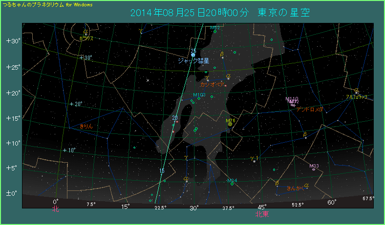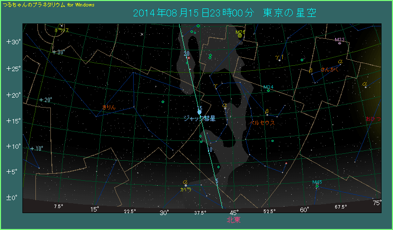 下の星図は8月5日、東京から見た1時ごろの北東の空のようすです。以前よりも早い時間帯に見えるようになってきましたので、今回の時間は1時としました。また、ジャック彗星が北の方へ移動していることから、見える方角も北東としています。