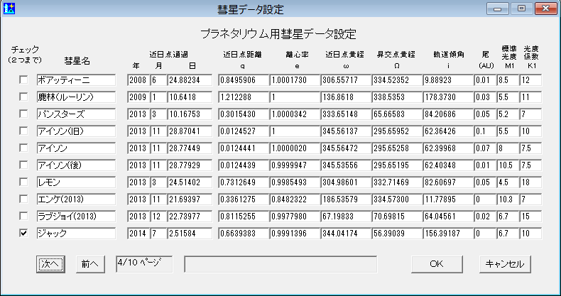 「つるちゃんのプラネタリウム」など、つるちゃんシリーズの各プログラムを使って、ジャック彗星のデータ登録をしてシミュレーションをされる場合は、次のようにデータ登録を行ってください。プログラムは当サイトトップページの[ダウンロードとご購入]より、ダウンロードしてご使用いただけます。