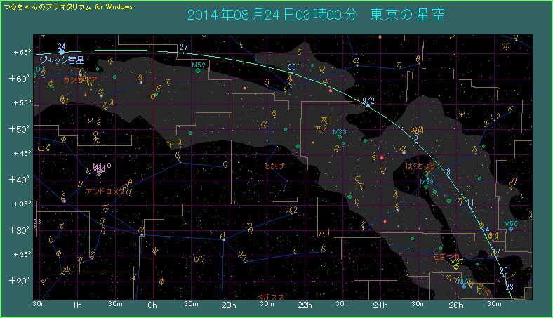 今日は8月25日です。ジャック彗星はさらに北上しており、この頃、最も北寄りに位置します。周極星となっていることから、1日中地平線下へ沈むことがありません。また、地球へも最も接近している時期で、この日は0.57AUまで近づいています。