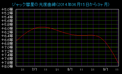 下のグラフはジャック彗星の光度変化を表したものです。7月上旬に最も明るくなって6等を超えますが、これはもちろん太陽に近づくためです。7月中旬に入って徐々に暗くなりますが、8月になると6.4等前後でいったん踏みとどまります。これは、太陽から遠ざかることにより減光するのと、地球へ近づくことにより増光するのが、ちょうど釣り合うためです。しかしその後は地球からも遠ざかっていくため、一気に暗くなることがわかります。