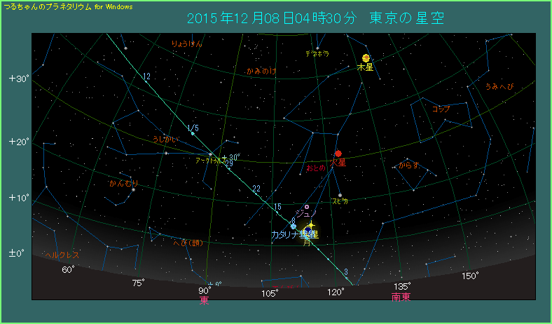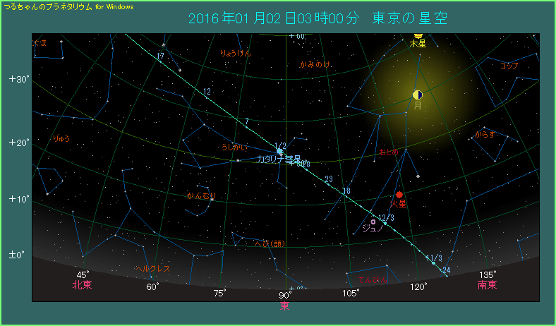 なお、元旦の場合はアークトゥルスのすぐ右横、1.2度離れたところにあります。位置関係が2日の場合と異なりますから注意しましょう。
