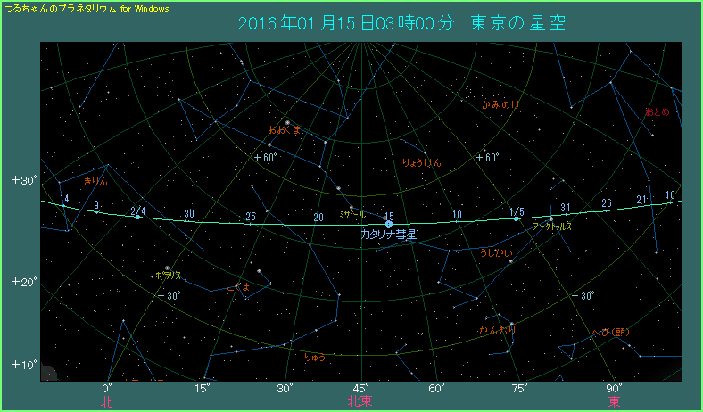 元旦から1月2日にかけて、カタリナ彗星がオレンジ色のアークトゥルス(うしかい座α星、0.2等)に近づきます。星図は1月2日3時ごろに見える位置です。間隔は0.9度ですから、双眼鏡ならアークトゥルスを視野に入れるだけで、簡単にカタリナ彗星が見つけられます。天体望遠鏡でも低倍率にして広視界のアイピースを使えば、同一視野で眺めることができます。こんな機会はめったにありませんから、絶対に見つけたい方は見逃さないようにしてくださいね。