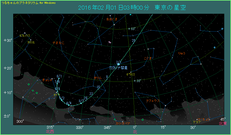この後カタリナ彗星は日増しに一気に暗くなっていきます。翌月3月1日の明るさは8.2等ですから、双眼鏡で見納めとなる日は遠くありません。まだ見られていない方は、できるだけ早い時期に見ておきましょう。