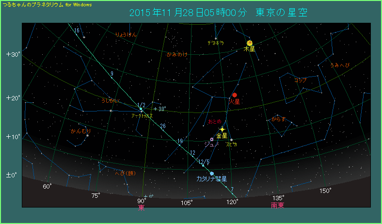 11月末になるとカタリナ彗星が、日本でも夜明け前に見え始めます。11月28日に東京の場合だと、空が明るくなり始めるのは4時59分です。星図で示した5時は、まさに薄明が始まる時間帯ですから、手際よく観測を済ませる必要があります。