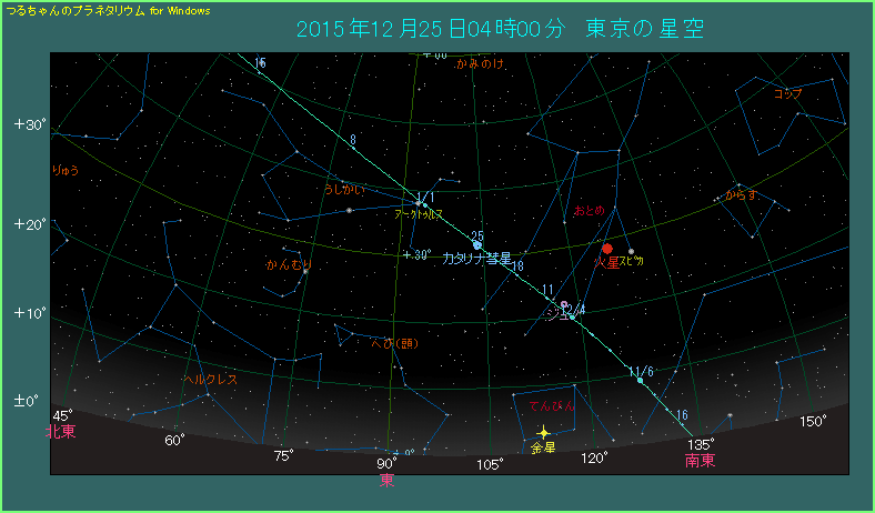 クリスマスの早朝、カタリナ彗星の明るさは4.5等です。相変わらず4等台をキープしており、ピークに近い状態が続いています。まず、真東方向の空の中ほどに目を向けましょう。すぐにオレンジ色に光る0等星のアークトゥルスが見つかります。アークトゥルスから右下方向へ双眼鏡の視野をずらしていくと、ボンヤリしてとらえどころのない淡い天体が見つかるでしょう。それがカタリナ彗星です。