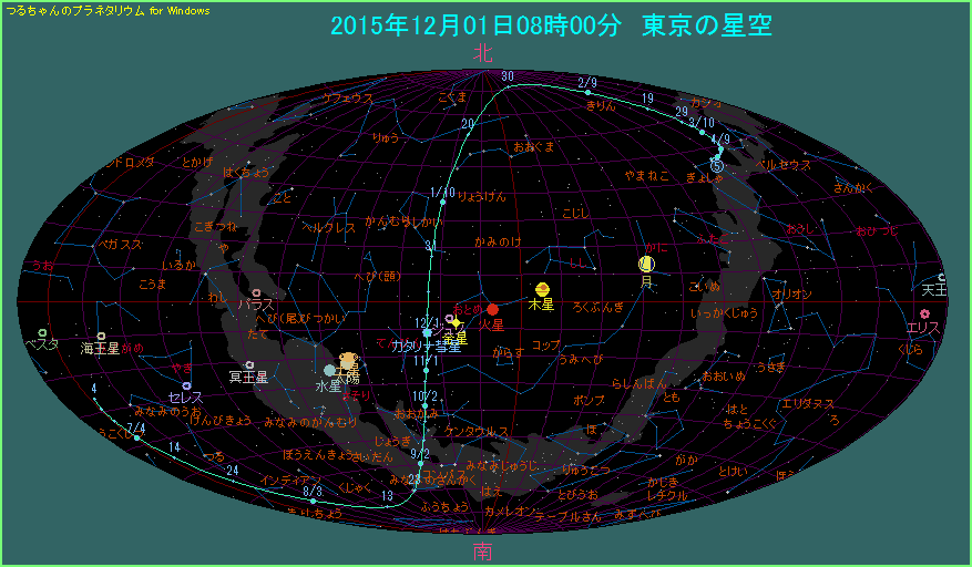 カタリナ彗星は11月16日に近日点を通過しており、4.3等という明るい状態です。高度は8.8度と決して高くありませんが、観測できないことはありません。非常に明るい金星がはるか上方にありますから、だいたいの目算をつけて双眼鏡を振り向けてください。付近に明るい星雲状の天体はありませんから、モヤッとした天体が見つかれば、それがカタリナ彗星です。