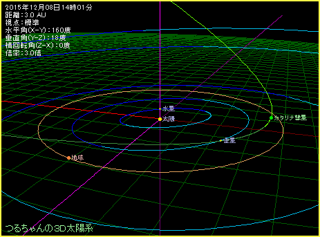 下の図は「つるちゃんの3D太陽系 シェア版」を使って、カタリナ彗星の軌道を描いたものです。図のように2015年12月8日の場合ですと、地球から少し遠い位置にあります。そして、現在位置(緑色の丸印)から上方向、左上方向へと動いていきます。