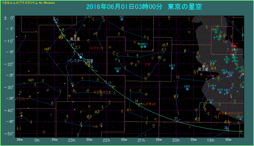 下の星図はパンスターズ彗星が通る経路を示した星図です。5月頃はみずがめ座にあって、次第に南下します。6月になると、みなみのうお座からけんびきょう座に入り、動きが大きくなります。いて座の南東端をかすめた後は、6月下旬にぼうえんきょう座に移り、南に下がって観測条件が悪化します。