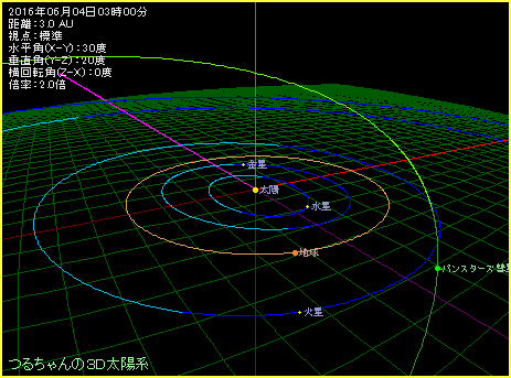 下の図は「つるちゃんの3D太陽系 シェア版」を使って、パンスターズ彗星の軌道を描いたものです。軌道図のように6月4日の場合だと、彗星は薄い緑色部分にありますので、地球軌道面よりも南側にあることがわかります。その後も図で下の方向へ動きますから、日本などの北半球からは観測条件が悪くなっていきます。