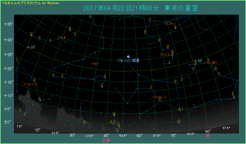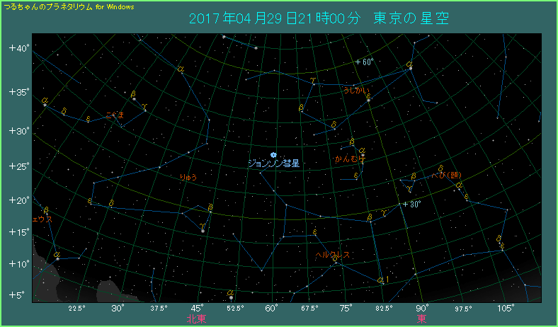4月のジョンソン彗星は、北東の空の中ほどよりも少し低い位置に見えます。星座でいえばヘルクレス座になりますが、うしかい座との境界付近です。