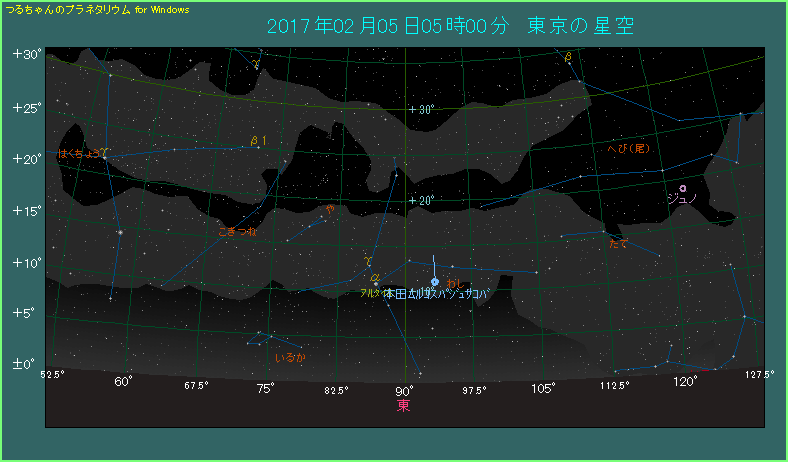 2月になると本田・ムルコス・パジュサコバ彗星が夜明け前の東天に姿を見せるようになります。2月5日の明るさは6.6等ですから、双眼鏡でも見つけられます。朝5時ごろには、わし座の1等星アルタイルの右側に見えますので、目印にされるとよいでしょう。月がなくて暗夜で観測できます。