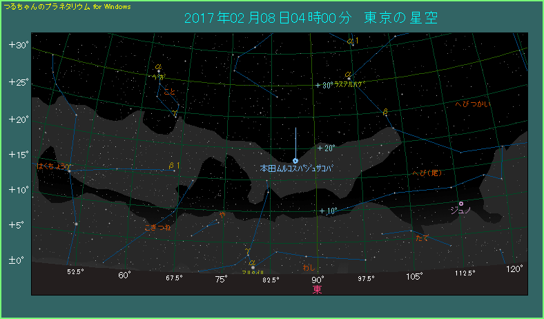 2月8日の早朝4時ごろ、本田・ムルコス・パジュサコバ彗星が見える位置はほぼ真東の方角で、比較的低い場所です。東京では月が沈んだ直後ですから、以降1時間ほど暗夜で観測できます。明るい星が少ない領域ですので探すのに少し苦労するかもしれません。明るさは6.4等で、ほぼピークに達しています。