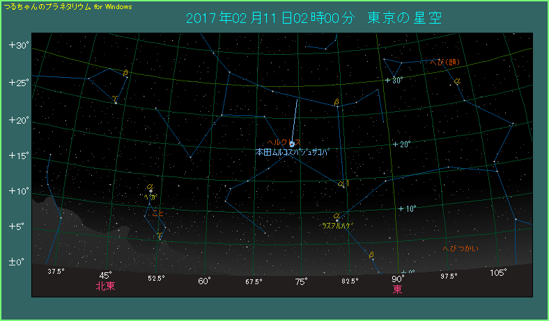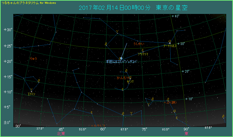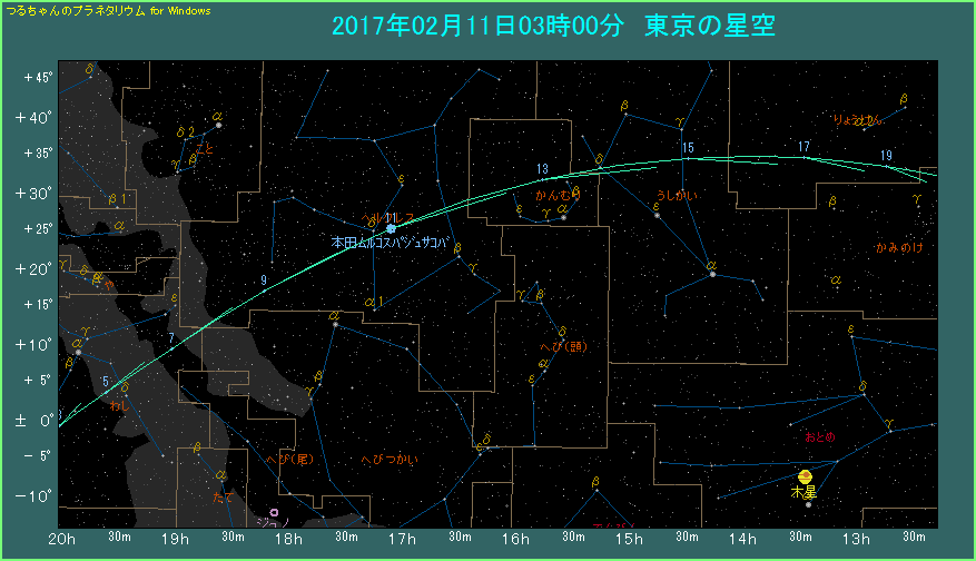 2月上旬はわし座にあります。この頃は動きが小さいですが、地球へ近づくとともに動きが大きくなまります。これに合わせて2月末にかけて、ヘルクレス座、かんむり座、うしかい座、りょうけん座へと順番に移動します。