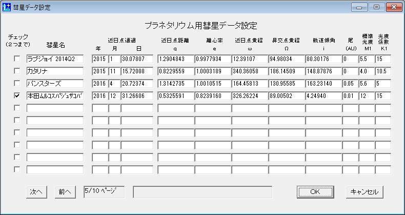 4.彗星データ設定画面の左下にある[次へ]ボタンを何度か押す。