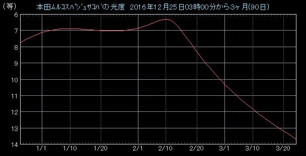 下の図は本田・ムルコス・パジュサコバ彗星の光度変化を表したグラフです。これを見ると 2月10日前後に、6等台前半でピークを迎えます。これは彗星が地球に0.08AUと大きく近づくからです。その後は地球から離れるとともに、太陽からもどんどん離れていきますので、光度は一気に落ちていきます。