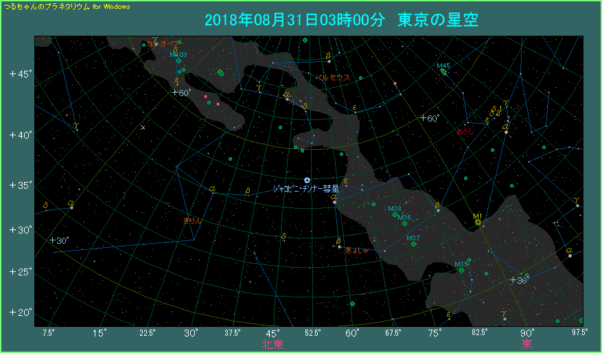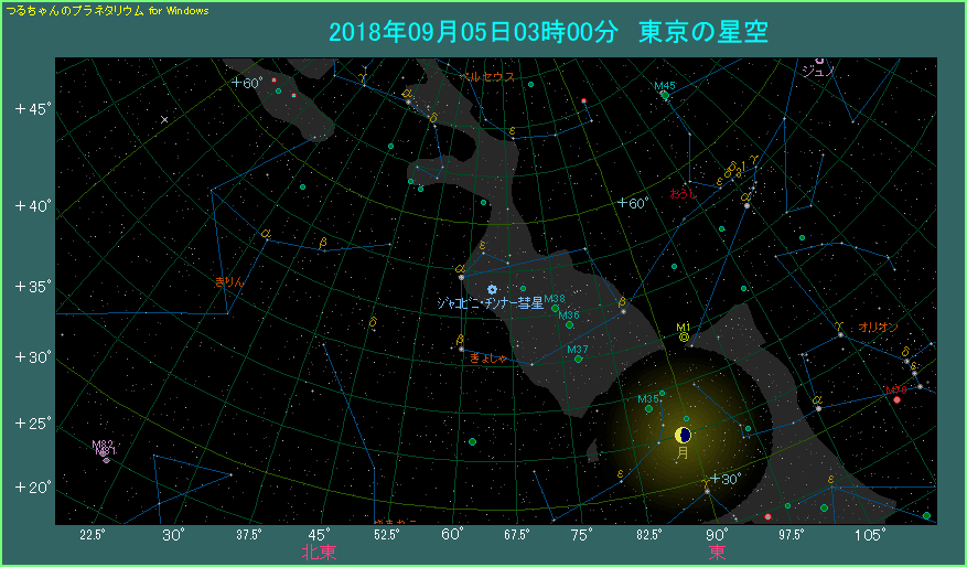 9月3日にカペラへ1度まで大接近したジャコビニ・チンナー彗星は、ぎょしゃ座が作る五角形の内側へ入ってきました。この日、カペラとの間隔は3.4度ですから、今日も接近状態が続いています。10倍くらいの双眼鏡でも同一視野で楽におさまりますから、探す苦労はありません。ぼんやりした天体を探しましょう。近くに明るい散開星団が3つあり、同じような見え方をしますが、カペラから離れているので間違えることはないでしょう。