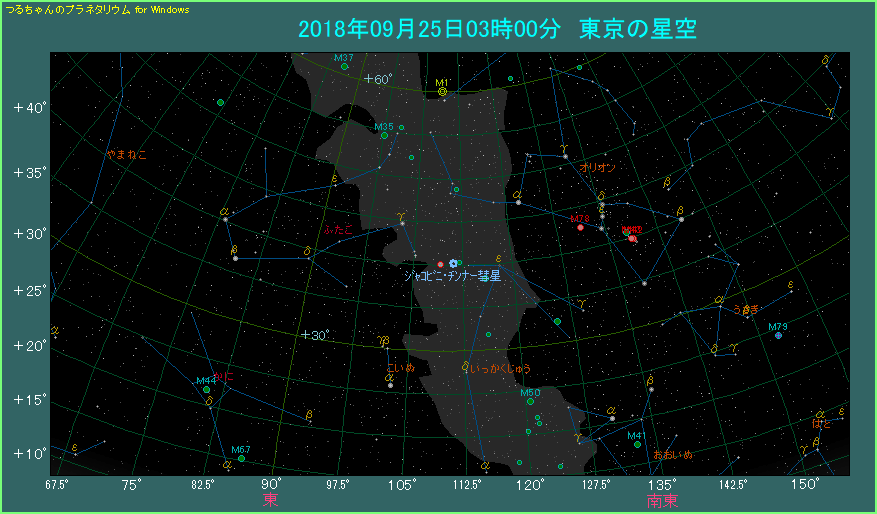 この日の月齢は24.3です。半月よりも少し細くなったとはいえ、ジャコビニ・チンナー彗星から25度しか離れていませんので、月明かりの影響を受けそうです。彗星の高度が10度台と低くなってしまいますが、前日の23時台(月が昇る前)を狙ってみるのも一考です。