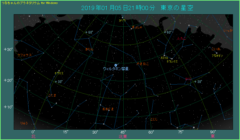 21時ごろ北東の方角をご覧ください。空の中ほどにウィルタネン彗星が見えます。大晦日よりもぎょしゃ座から遠ざかり、北斗七星が作るひしゃくの先端と、カペラの中間付近までやってきました。