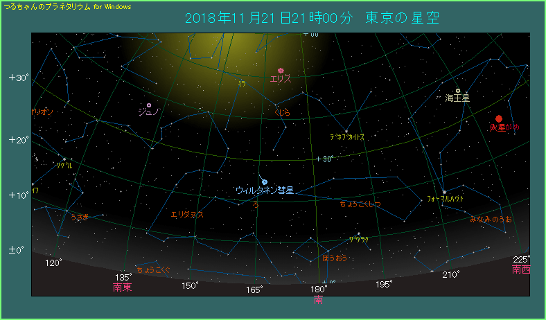 夜の21時ごろに南の空をご覧ください。比較的低い位置にウィルタネン彗星があります。すでに5.5等まで明るくなっており、市街地からでも双眼鏡を使えば見つけられる明るさです。