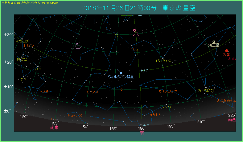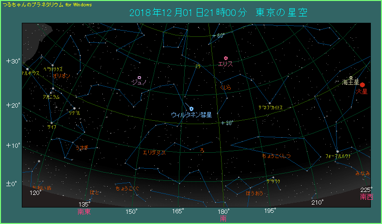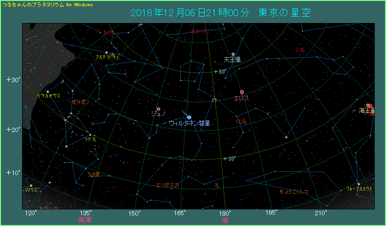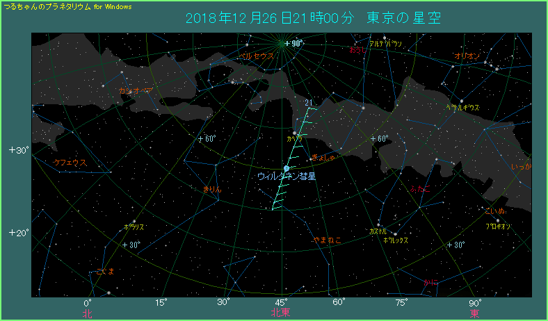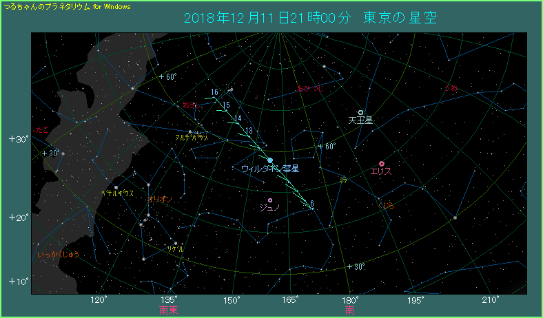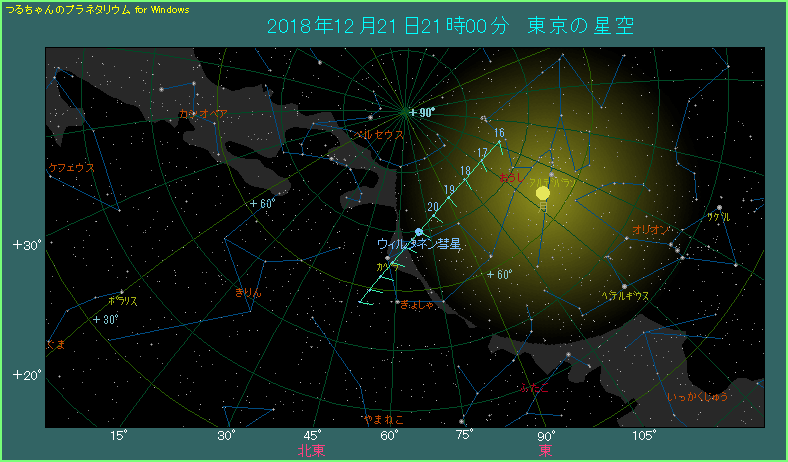 ウィルタネン彗星が北上してきたことで、一日中沈まない周極星として、一晩中観測できるようになります。月も翌日2時19分まで昇ってきませんから、彗星観測を十分楽しんでください。