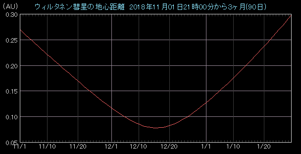 下の図は地球との距離変化を表したグラフです。12月上旬から下旬にかけて0.1AUを切っており、地球へ近づいた状態です。それからグラフではわかりませんが、12月12日に近日点通過し、太陽に1.0554AUまで近づきます。