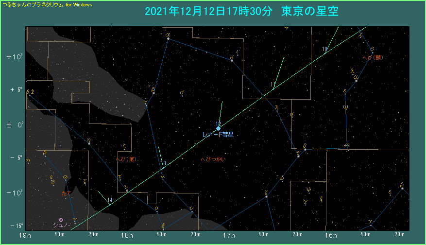 この期間のレナード彗星の位置は、うしかい座からへび座の付近です。いずれも形がハッキリした星座ですから目印になる星があり、比較的探しやすいでしょう。