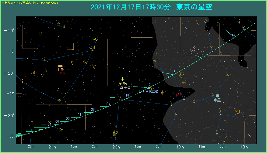 12月の後半はいて座からけんびきょう座に移ります。彗星は地球から遠ざかって動きが緩やかになり、光度も落ちてきます。南へ移動する(星図上で下へ動く)ため日本から観測しづらくなり、そろそろ見納めが近づきました。