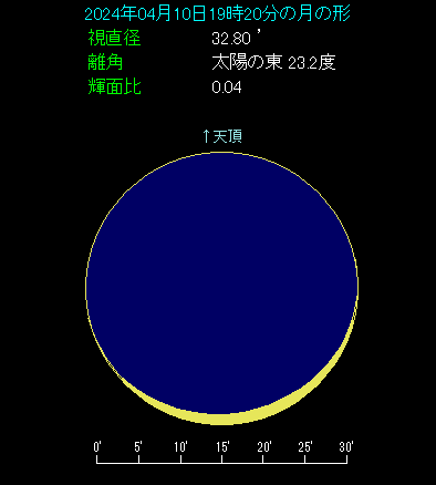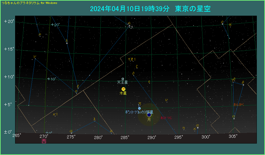 4月10日は月齢1.7の細い月が、ポンスブルックス彗星に2.7度まで接近します。明るさは4.8等ですから、条件が整えば双眼鏡でも十分見つけられる明るさです。双眼鏡で見ると月と同一視野に見えますので、淡いポンスブルックス彗星を見つけるには絶好の機会です。月の左上にぼんやりした星雲状の天体が見つかれば、ポンスブルックス彗星に間違いありません。