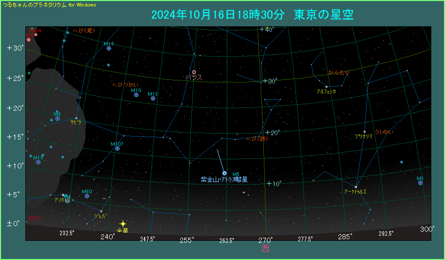 紫金山・アトラス彗星は、今日もへび座にある大型の球状星団M5に近づいて、二つの天体が最接近しています。間隔は昨日よりもやや狭くて2.8度です。昨日は縦に並びましたが、今日は斜めに並んでいます。紫金山・アトラス彗星は日々移動しているんだなあと、実感させられます。二天体の接近は今日が見納めですので、しっかりご覧になってください。