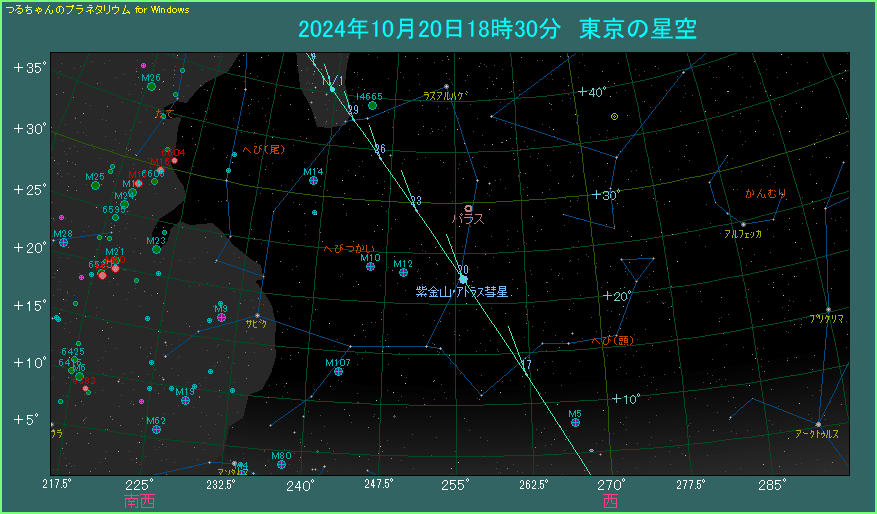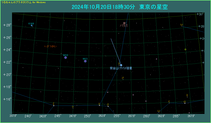 なお、今日と明日と明後日は、紫金山・アトラス彗星が球状星団M12(6.6等級)に近づいています。それぞれ間隔は5.7度、4.5度、5.0度ですから、7倍くらいの倍率の双眼鏡なら、同一視野で見ることができます。こちらもいっしょに楽しんでください。