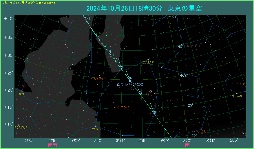 最近の紫金山・アトラス彗星はへびつかい座にありますが、ここへきて一日あたりの移動量が少なくなってきました。後に書きますが、地球からも太陽からも遠ざかってきましたので、当然と言えば当然のことです。今日の月齢は23.6ということで月明かりの影響もなく、安心して観測することができます。