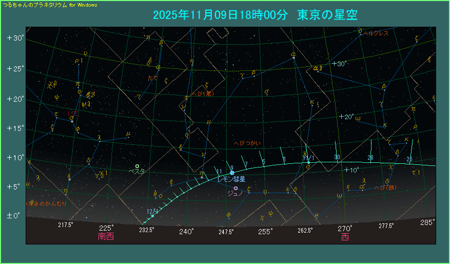 レモン彗星は11月8日に近日点を通過して、太陽から遠ざかり始めています。そして地球からも遠ざかる一方ですから、この後レモン彗星の明るさはドンドン暗くなります。今日の明るさは5.0等で、肉眼彗星でいられるのも11月20日までです。おまけに高度が下がってきて、観測条件は悪くなる一方です。それでもまだ5.0等ですから、郊外なら双眼鏡を使えば十分見える明るさです。