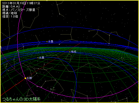 「つるちゃんの3D太陽系」は2007年4月以来、実に6年ぶりのバージョンアップです。こちらもアイソン彗星の不具合対応がメインですが、座標軸がガクガクしないように対応し、格子を細かく表示するようにしています。下の絵のように、シェア版では座標軸がきれいに曲線で表示されています。